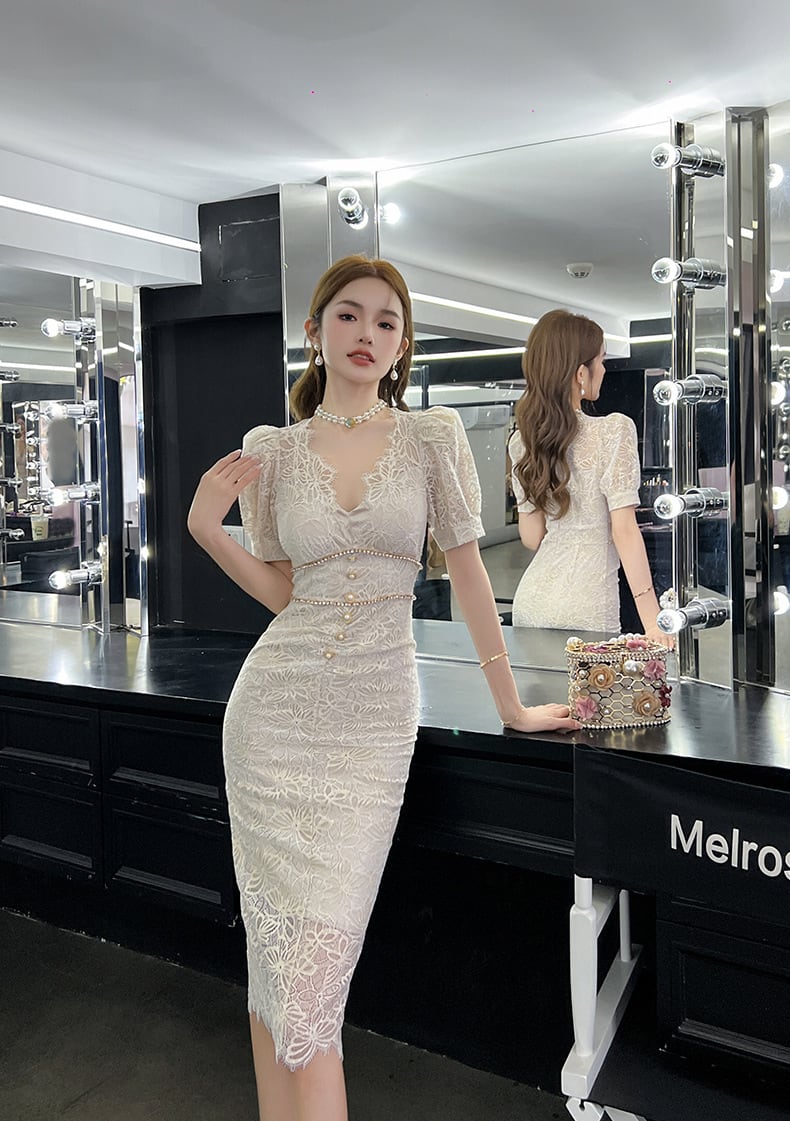 繊細なフラワーレースが目を惹く、クラシカルなペンシルシルエットドレス。
