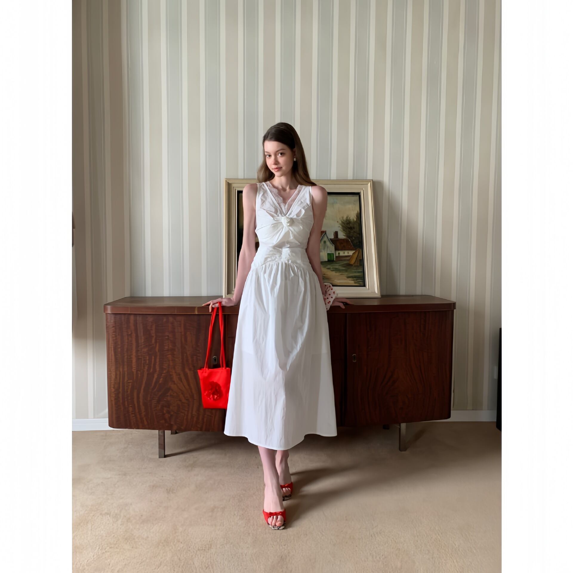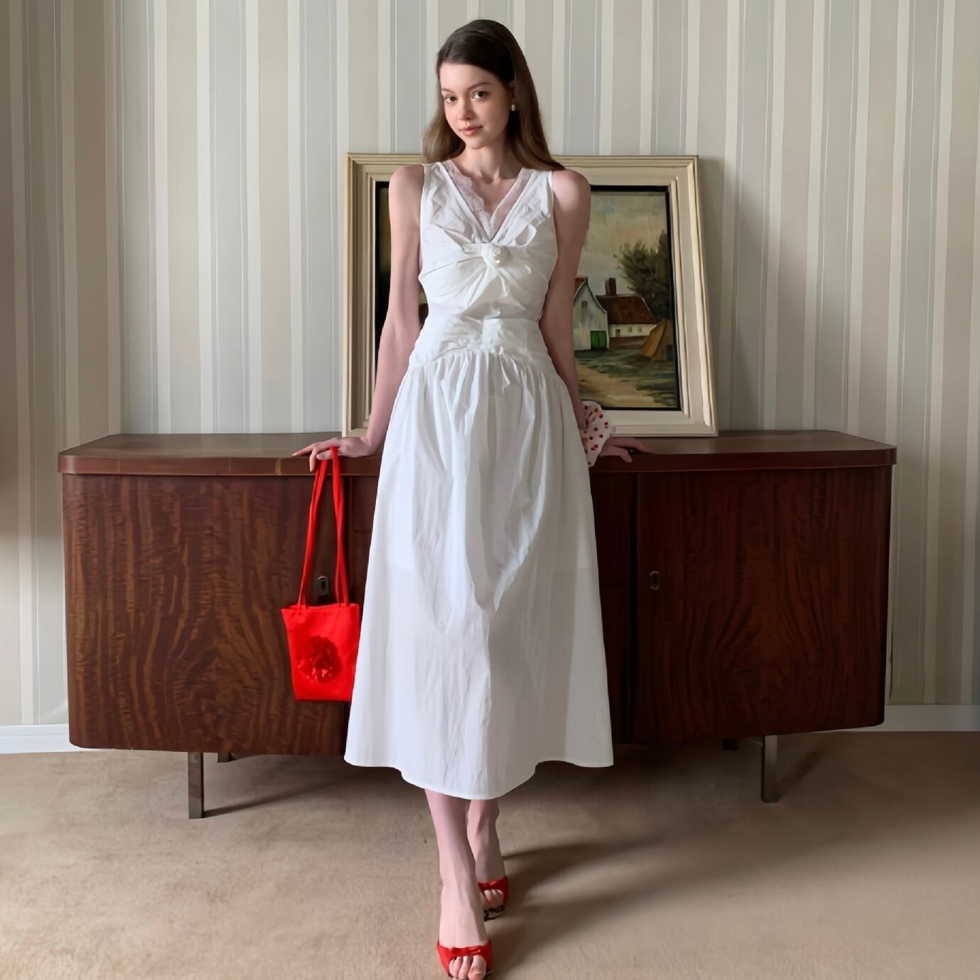 清楚さとフェミニンさを兼ね備えたホワイトミディドレス。