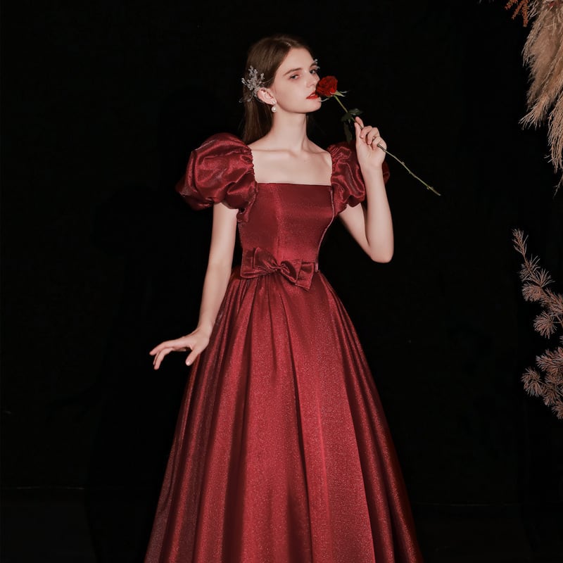 深みのあるワインレッドが、シックでエレガントな印象を与えるパフスリーブ ロングドレス。華やかさと洗練されたデザインが融合し、特別な瞬間を一層美しく演出します。