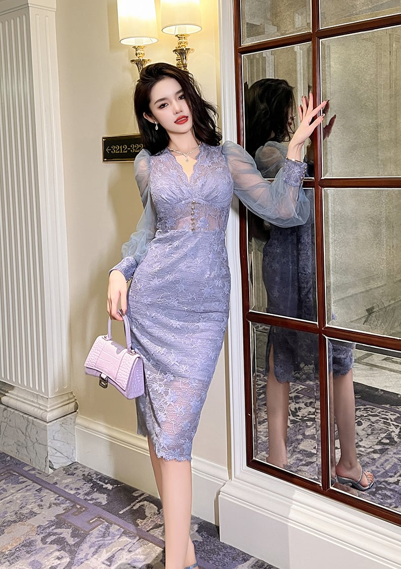 レース シースルースリーブ ワンピース(パープル・グリーン)
